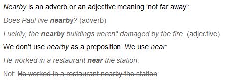 Nearby" (Close By) As An Adjective, A Preposition, Or An Adverb - English Language Learners Stack Exchange from ell.stackexchange.com